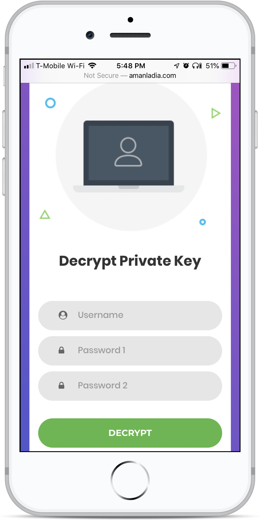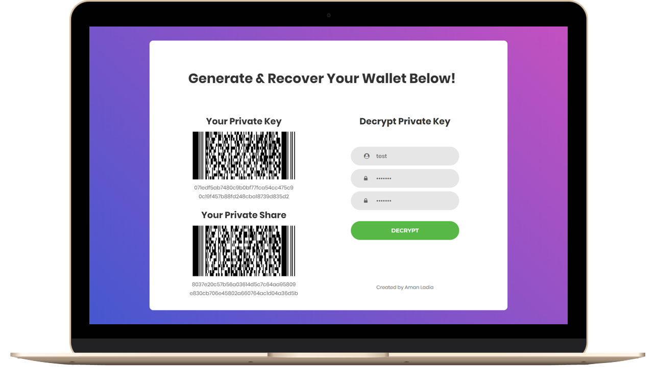 Simply head over to our ZeroWallet app, fill in a unique username, and pick two strong, distinct passwords. Hit decrypt, and within a few seconds you will have your private key and private share right in front of you.